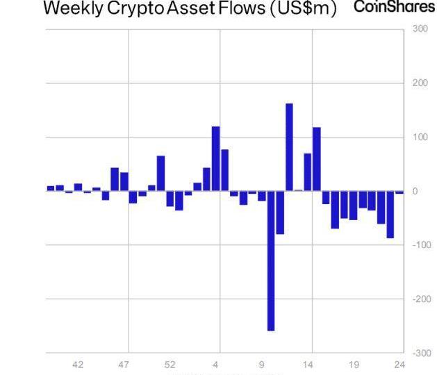 根據CoinShares最新的數字資產資金流向報告,上周數字資產基金約有510萬美元流出,連續第九周持續流出。