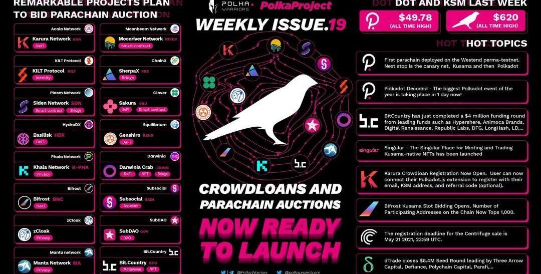 目前Kusama上的首條平行鏈——公益平行鏈Statemine已經上線。將于近期開啟平行鏈插槽拍賣,這將是Kusama乃至整個波卡生態發展的里程碑。下圖為PolkaProject整理的將參與Kusama插槽拍賣的項目。