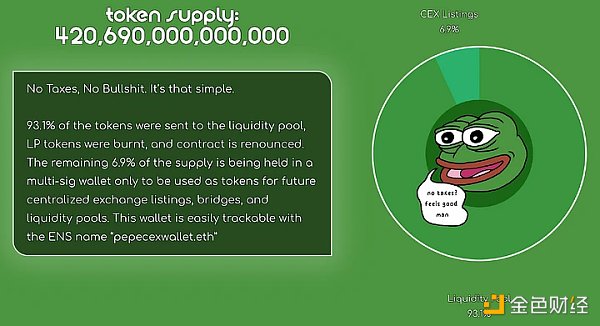 根據官網的公布,PEPE 代幣總量為 420, 690, 000, 000, 000 個(420 萬億),其中 93.1% 的 PEPE 代幣被發送到流動性池,剩余的 6.9% 的代幣存放在一個多簽錢包中,僅用作未來中心化交易所上幣、橋接和流動資金池。