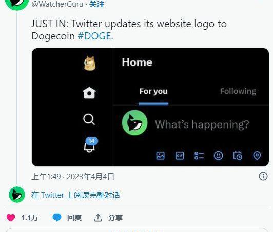 周一,對于網絡瀏覽器上的用戶,Twitter著名的藍鳥標志被狗狗幣的標志所取代。狗狗幣在開發后的幾分鐘內飆升30%,使其成為當天表現最好的加密貨幣。