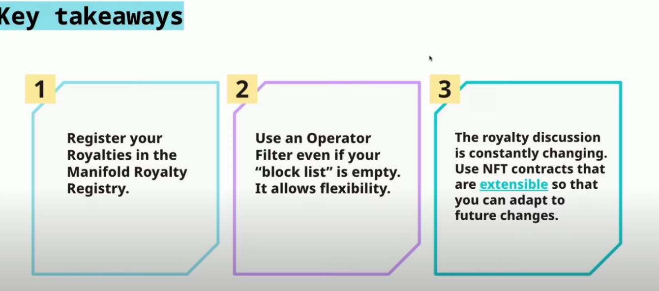 最后,版稅的相關討論每天都在變化。我今天談到的這些事情中,有些是在過去幾個月中產生的,所以我們不要做出任何倉促的決定。如果你要創建一個 NFT,請確保 NFT 是可擴展的。可拓展與可升級是完全不同的,對于任何技術人員來說,你知道你可以非常容易地創建一個可升級的智能合約。這當然是一個選項,但如果你不想這么做,因為你不想擁有所有的控制權,在去中心化方面做得更多,你就可以讓你的 NFT 具有可擴展性。