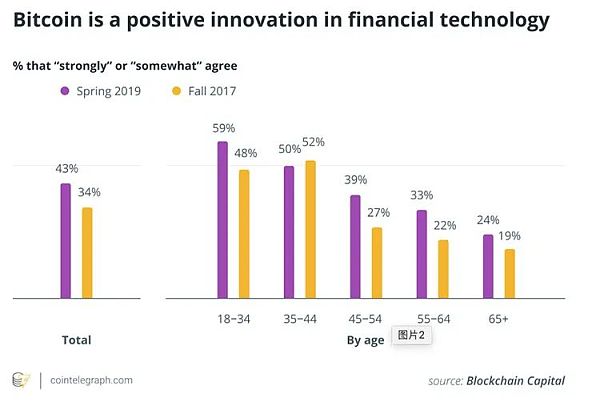 2019年4月進行的一項哈里斯線上民意調查發現,18-34歲的人了解比特幣的幾率是65歲以上人群的三倍,是50-64歲人群的兩倍。在熟悉度方面,他們超過了所有其他年齡段。
