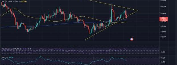 從當前的每周高點0.095美元回落11%確保價格突破支撐線。截至發稿時,它的交易價格為0.083美元,下一個支撐位有望在0.080美元附近顯示短期支撐。