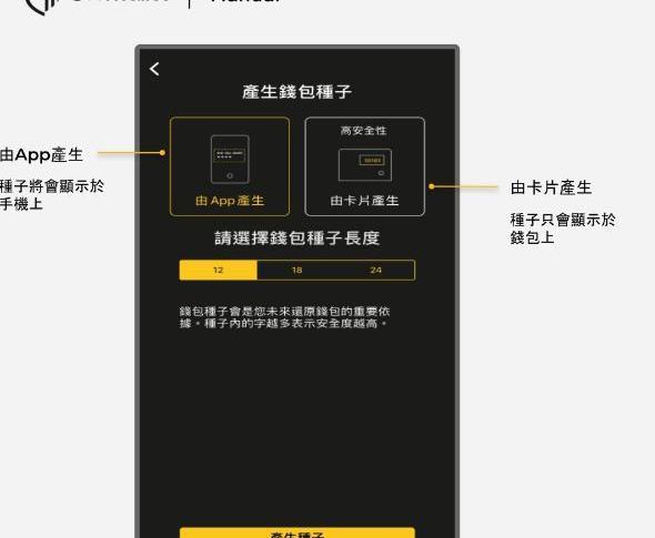選擇生成錢包種子的方式,CoolWallet產生錢包種子的方式有2種,分別為「由App產生」和「由卡片產生」,建議選擇由卡片產生,安全性會比較高一點。