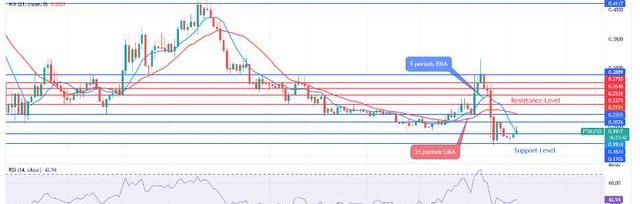 Fantom價格在9周期EMA和21周期EMA下方交易,密切接觸表明看跌勢頭。相對強度指數周期14處于42水平,信號線指向上方,表示買入信號。如果賣家聚集了足夠的壓力來打破18美元的支撐位,那么可能會測試0.16美元和0.14美元的水平。如果買家的壓力增加,價格可能會上漲以突破0.20美元的水平,并將價格暴露于0.22美元和0.23美元的阻力位。