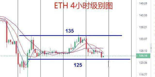 目前ETH日線級別和4小時級別均線均是勾頭向下,日內我們關注125-135區間,操作上高空為主,一旦向下破位125,下跌延續。