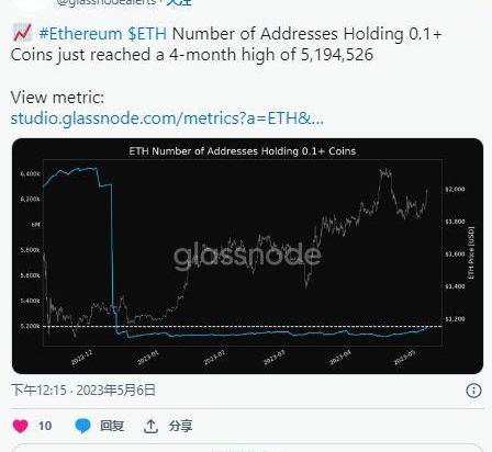 Glassnode的數據表明散戶對以太坊的興趣激增,越來越多的地址持有超過0.1ETH。