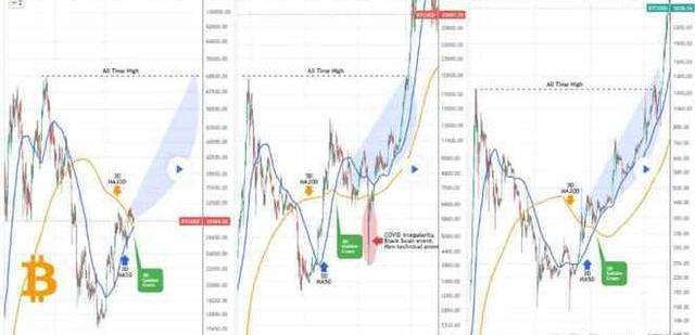 當短期移動平均線上升至長期移動平均線上方時,就會出現黃金交叉形態。這基本上表明了加密貨幣的積極趨勢。在前兩次金叉期間,比特幣價格隨后大幅上漲。