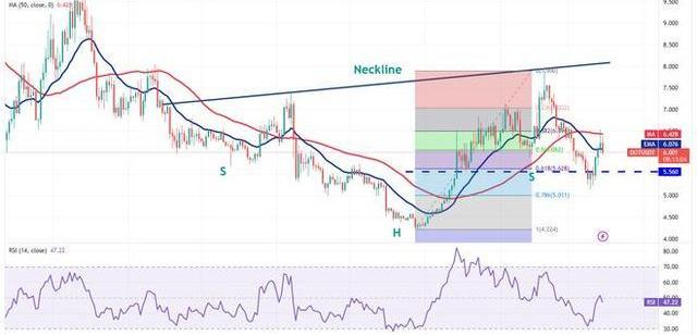 如果買家將價格推高至50日均線上方,則該貨幣對可能會獲得動力并飆升至反向H&S形態的頸線。不利的一面是,空頭將不得不將該貨幣對跌破5美元以表明卷土重來。