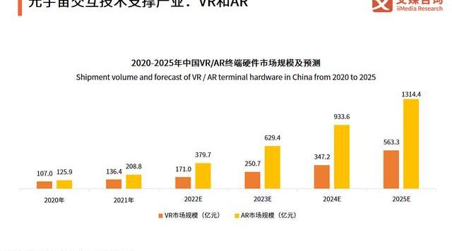 隨著中國VR/AR終端硬件出貨量的快速增長,VR/AR終端硬件市場規模也在不斷擴大。數據顯示,2020年中國VR終端硬件市場規模為107.0億元,AR終端硬件市場規模為125.9億元,預計到2025年,中國VR和AR終端硬件市場規模分別達到563.3億元和1314.4億元。艾媒咨詢分析師認為,隨著元宇宙概念的興起,VR/AR行業未來發展將更加受到業界的關注。
