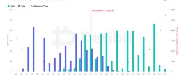 雖然視頻說過四月交割期權的數據,但還是想展開講講,畢竟四月的情況可能會更加復雜一些。首先是BTC截止到4月28日的期權交割情況,可以看到當前的最大痛點是25,000美金,而目前的BTC價格是接近28,000美金。還有超過一個月的時間,未必不是沒有機會達到。尤其是空多比目前已經達到了0.77。