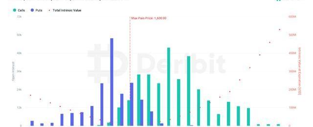 其次是ETH的數據。可以看到當前的最大痛點是1,600美元,對比BTC的匯率在0.064,也較為符合當前的走勢。這也說明了如果BTC達到了最大痛點,ETH大概率也會達到,尤其是在下跌的過程中,很有可能ETH的下跌幅度會更大一些。不過就像以往一樣,目前ETH的空多比依然低于BTC,為0.6。