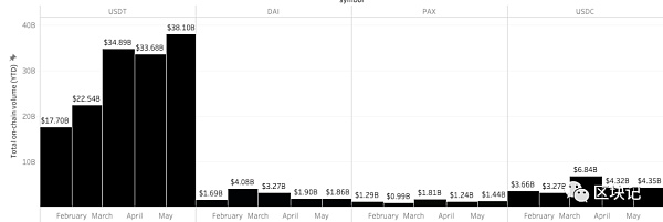 1月份,穩定幣的鏈上交易量為260億美元。5月份,這個數字為490億美元。這種以美元計算的增長大部分又來自USDT。換句話說 - Tether在鏈上交易的金額大約增加了一倍,而其最接近的同行(USDC)在過去6個月里只有50%的增長。像DAI這樣的強有力的競爭者自3月份預言機發行以來出現了下降,并且一直在緩慢恢復。目前,Tether占主導地位。