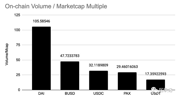 接下來的問題是如今穩定幣的增長是否都來自于Tether。這個冪次分布相當耐人尋味。一方面,Tether是明顯的主導領導者,交易次數和交易量都超過70%。然而,DAI比一些中心化的同行顯示出更多的交易次數,并且在交易量方面也一直是領先的。這可能是因為其在DeFi中的使用。基于交易所的穩定幣主要用于場外交易,其供應量(按市值計算)要高得多,平均交易規模也較大。然而,由于使用DAI的人通常使用它來進行杠桿頭寸交易或在DeFi協議中使用,所以交易頻率更高。換句話說,作為一種貨幣,DAI的使用頻率很可能比其同行在常規基礎上更高。