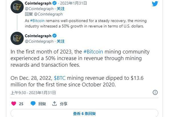 比特幣(BTC)開始顯示出適度牛市的跡象,表明其努力正在取得成果。在2023年的第一個月,挖礦獎勵和交易費用使挖礦社區的收入增加了近50%。這被認為是可以幫助BTC限制其損失的最重要因素之一。