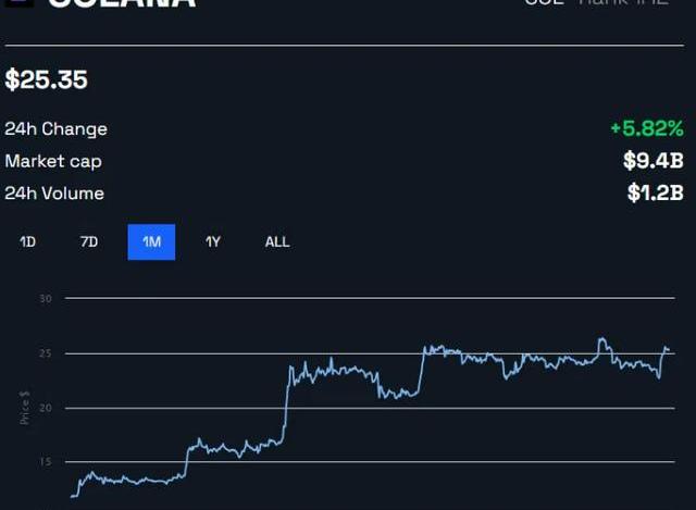 SOL價格在過去12小時內飆升了12%。該代幣從22.64美元攀升至盤中高點25.64美元,隨后略有回落但仍保持在25美元上方。
