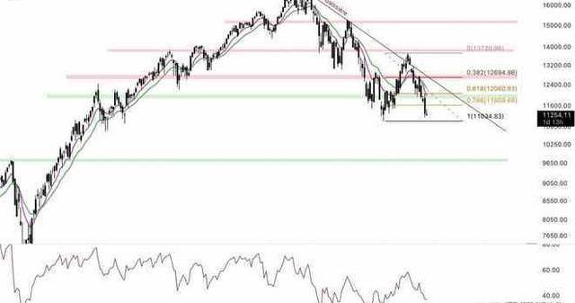今年夏天的反彈已經完全抹去。幾周內,納斯達克下跌了近20%。買家需要出現在11,000美元的低點,以避免恐慌情緒導致價格回升至9,700美元。勢頭依然強勁。事實上,如果出現新低,RSI可能會形成新的看漲背離。買家應避免收于29RSI以下。