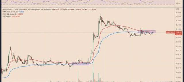 值得注意的是,DOGE價格試圖收于0.0917美元附近的50周和0.0895美元附近的200周EMA之上。這類似于其在2020年4月至11月的橫向行動和突破嘗試,當時價格上漲了30,000%。