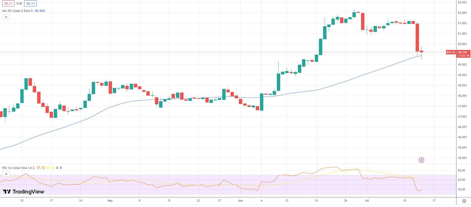 根據Tradingview的數據,7月14日亞洲交易期間,比特幣的主導地位下降至49.76%。