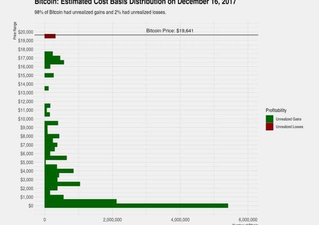 當時,在1675萬比特幣中,約有740萬被早期持有者持有,估計成本在0到100美元之間,此時98%的比特幣持有者有未實現收益。
