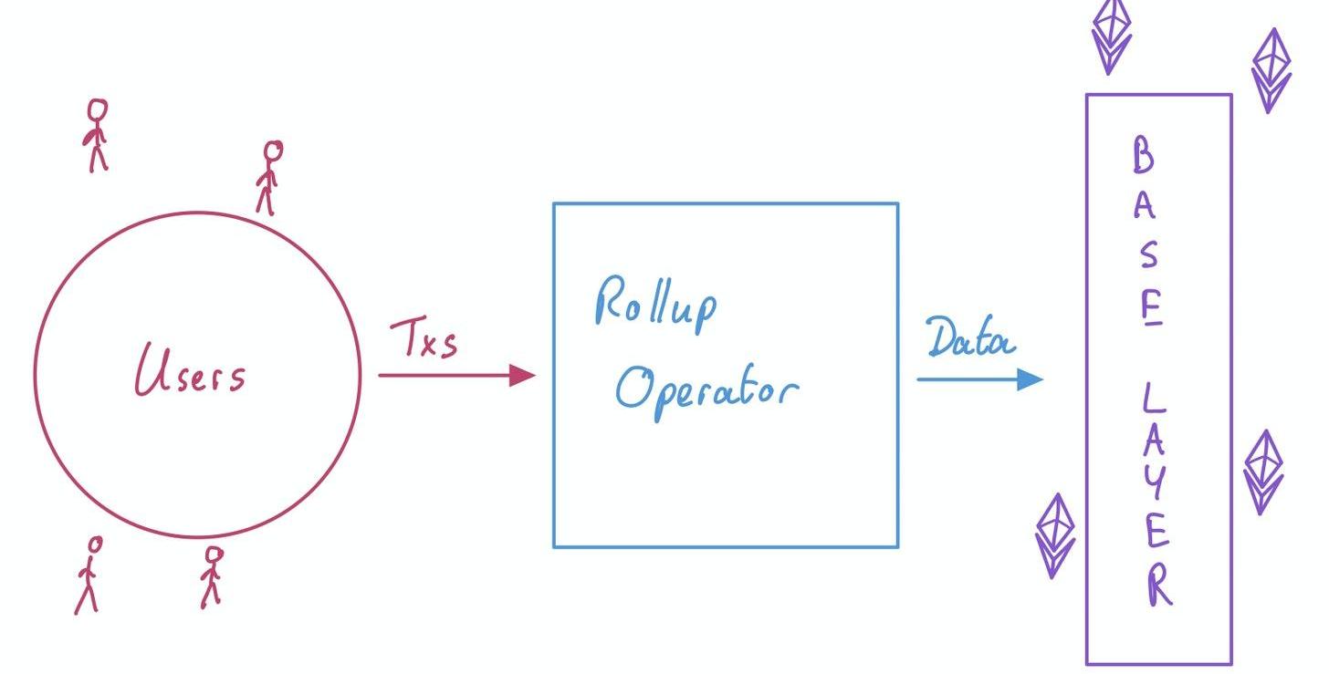 我們的擴容故事當中的三個角色:用戶在L2上進行交易,rollup運營商在用戶和基礎層之間作為一個接口,而最終的數據發布到基礎層