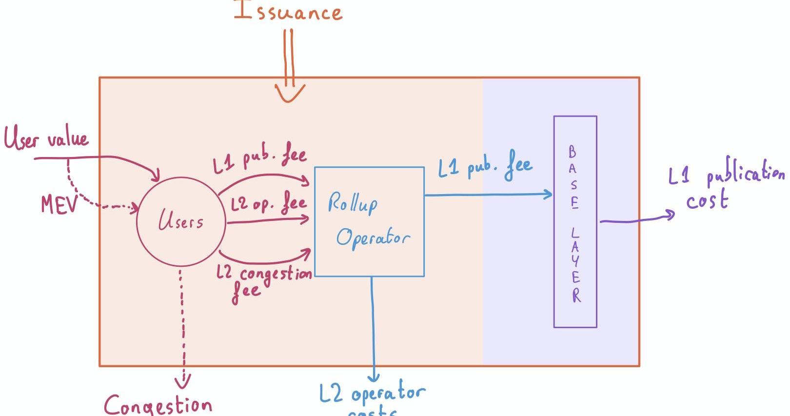 總而言之,一個rollup系統包含了三方:用戶、rollup運營商以及基礎層。運行系統會產生三種成本:運營成本、基礎層數據發布成本以及擁堵成本。而系統有兩種收入方式:交易價值以及發行。