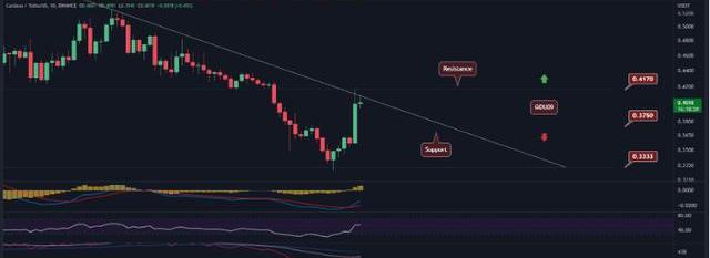 ADA終于成功扭轉下跌趨勢并反彈。買家積極進取,在突破0.38美元后一路將價格帶到關鍵阻力位0.42美元,這已成為當前的支撐位。這一大幅上漲使ADA在昨天的市場反彈中成為表現最好的股票之一。