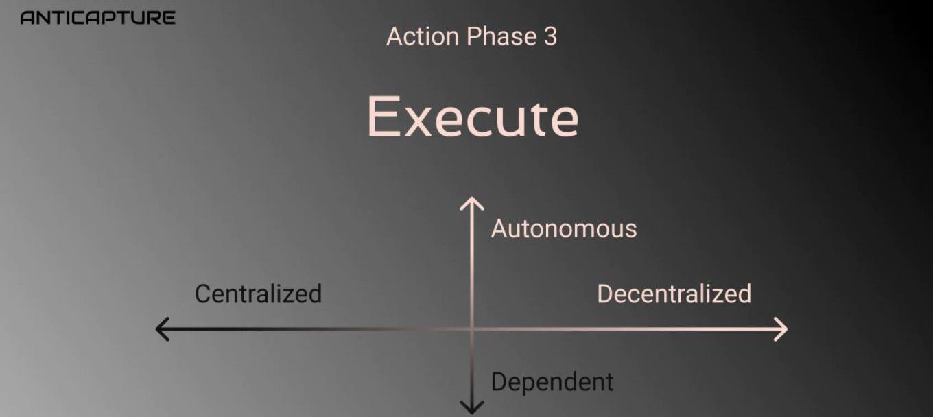 正如我們所提到的,在網絡中,可以參與此階段的代理以直接控制網絡共享資源的形式行使基本權力。如果這種權力集中在少數人手中,那么網絡很容易被內部代理人奪取。無論決策階段的去中心化程度如何,在結構上沒有什么可以阻止那些擁有執行權的人忽視結果并執行他們想要的行動。