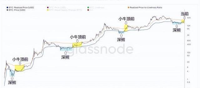 簡單刻下幣價小于BTC:RealizedPrice的“深熊階段”和幣價大于BTC:RealizedPrice且小于BTC:RealizedPrice與BTC:Liveliness之比的“小牛頂前”階段。