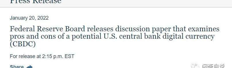 XRP/HKD-2.42%2022年1月20日,美聯儲發布首份數字美元討論文件,這是美聯儲繼歐洲央行、中國央行、英國央行之后就美國央行數字貨幣基本問題首次進行系統闡述并公開征求意見。