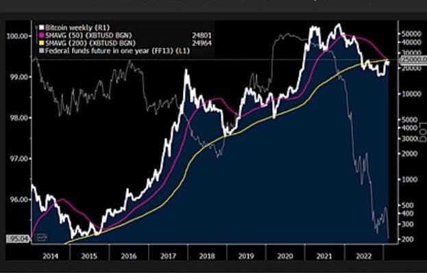 彭博高級商品策略師MikeMcGlone解釋了比特幣當前的技術設置如何支持戰術空頭。在整個美聯儲緊縮季節期間,比特幣的50周移動平均線從未跌破其200周移動平均線。然而,現在發生這種情況的可能性已經越來越近了。