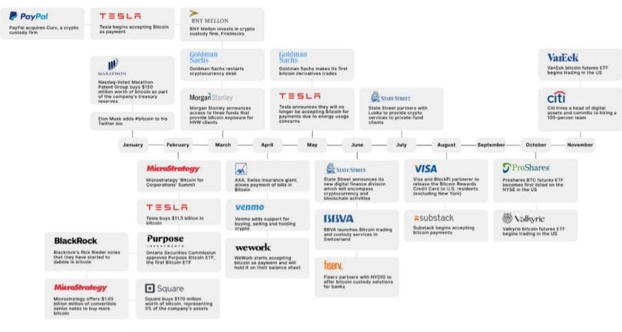 全年,許多知名公司購買了比特幣,其中包括Square,該公司將大約5%的資產分配給了比特幣。此外,WeWork、Substack和保險巨頭AXA開始接受比特幣支付。