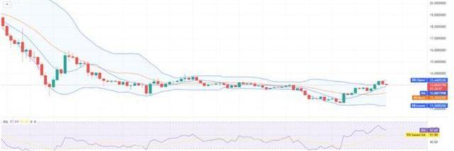 布林帶上軌目前位于13.44美元,而布林帶下軌位于11.26美元,如果繼續下跌,價格將很快跌破均線水平。RSI分數朝同一方向發展,在中性區域的上半部分已降至零。