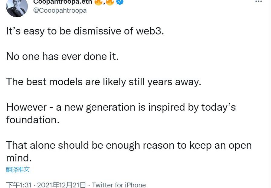 深耕DAO領域的KOLCoopahtroopa.eth則更加寬容,他指出盡管「對Web3.0不屑一顧是很容易的……可能還需要數年之久才會有最好的模型,然而新的靈感卻來自今天的基礎。僅此一點就足以讓我們保持開放的心態。」
