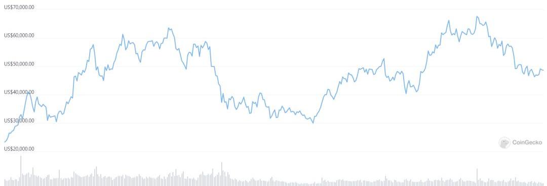 2021年開年,比特幣延續漲勢,從年初的29000美元不斷攀升,接連突破3萬、4萬、5萬、6萬美元關口,最終在上半年創下65000美元的新紀錄;進入5月,隨政策收緊以及市場獲利盤退出,比特幣迎來大幅回調,5月19日比特幣最低跌至3萬美元。