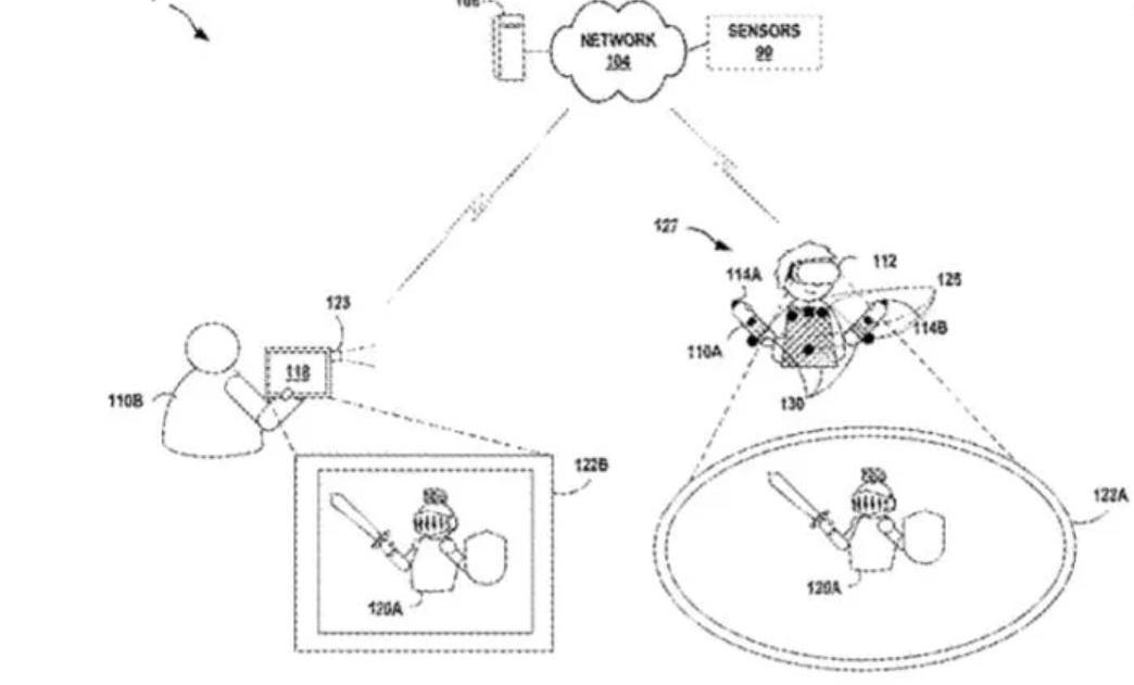 另外一項專利申請顯示,將一臺“可穿戴磁傳感器系統”放在身體周圍,可用于追蹤“身體姿勢”的變化。設計平臺Sketch的草圖顯示,一位用戶戴著該設備,但在虛擬現實中以士兵的身份出現,并佩戴著劍和盔甲。
