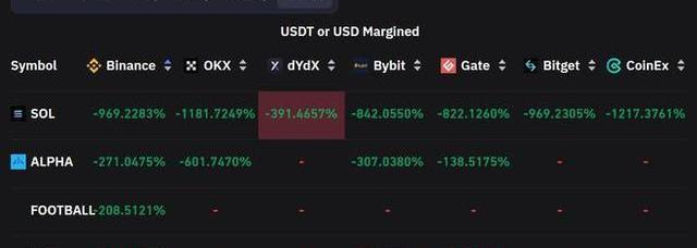 值得注意的是,Solana出現驚人的軋空行情,據Coinglass數據,在各大交易所上,SOLU本位合約出現驚人的年化資金費率,幣安達-969%,OKX達-1181%,dYdX達-391%,Bybit達-842%,Gate.io達-822%,Bitget達-969%,CoinEX達-1217%。