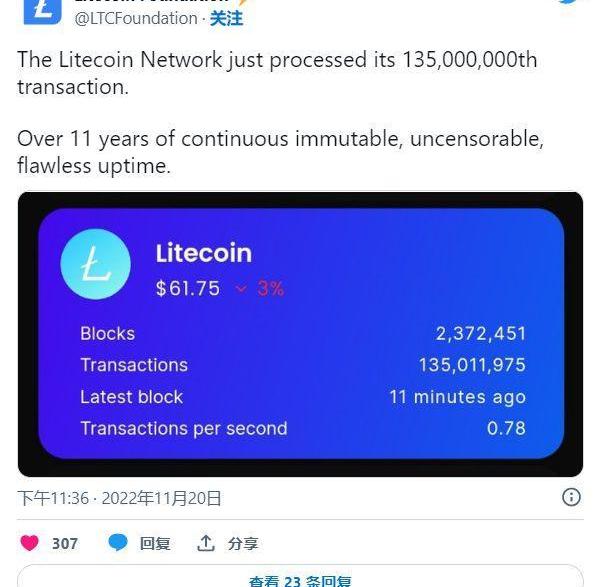 萊特幣(LTC)是另一種山寨幣,目前表現強勁,交易價格上漲3%,價格為62.07美元,市值為44億美元。它還使Solana成為按市值計算的第十五大加密貨幣。在過去的7天里,LTC價格上漲了8%。周一早些時候,萊特幣基金會分享了區塊鏈的一個重要里程碑。