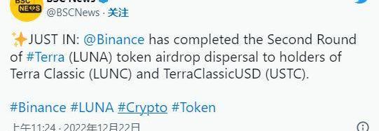 在網站公告中,加密貨幣交易所Binance表示已完成第二輪Terra(LUNA)分發給在快照期間持有TerraClassic(LUNC)和TerraClassicUSD(USTC)的合格用戶。
