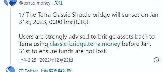 根據TerraClassic推特賬號的官方公告,TerraClassic穿梭橋將于2023年1月31日日落時分啟程。它敦促用戶在此日期之前將資產橋接回Terra,以確保資金不丟失。