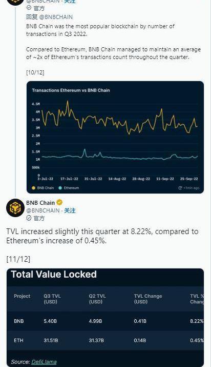 幣安幣在總鎖定價值(TVL)方面再次優于以太坊。根據BNB官方推文,其TVL本季度略有增長,為8.22%,而以太坊的增幅為0.45%。