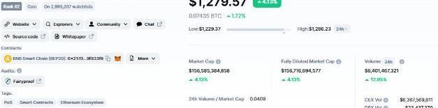 以太坊現價為1280美元,24小時交易量為60億美元。以太坊在過去24小時內上漲了近4%,CoinMarketCap目前排名第二,活市值為1560億美元。