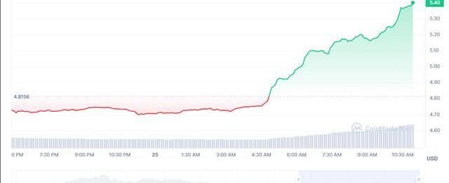 與此同時,CoinMarketCap的數據顯示,UNI和AAVE的價格在過去24小時的交易中都出現了大幅上漲。UNI價格上漲超過11%,交易價格為5.39美元。這使得加密貨幣的每周表現進一步上漲至+19.78%。