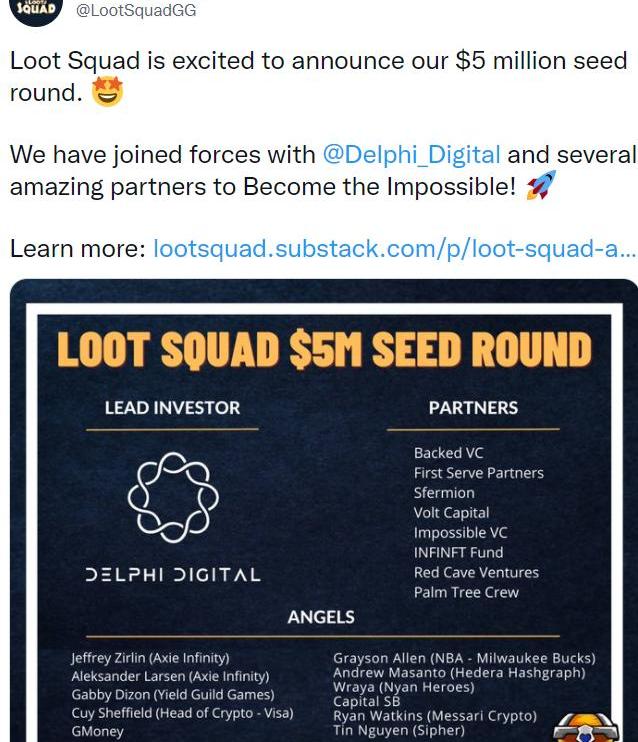 XRP/HKD-2.67%DeFi之道訊,12月2日,P2E游戲社區LootSquad宣布完成500萬美元種子輪融資,DelphiDigital領投,Impossiblevc,INFINFTFund,RedCave,Ventures,PalmTreeCrew,以及JeffreyZirlin(AxieInfinity)、AleksanderLarsen(AxieInfinity)、GabbyDizon(YieldGuildGames)等天使投資人參投。新資金將用于為LootSquadAdventurers拓展規模,投資游戲資產,以及開發消費者產品,改善P2E游戲的增長和穩定性。LootSquad將于本月晚些時候發布新的路線圖。