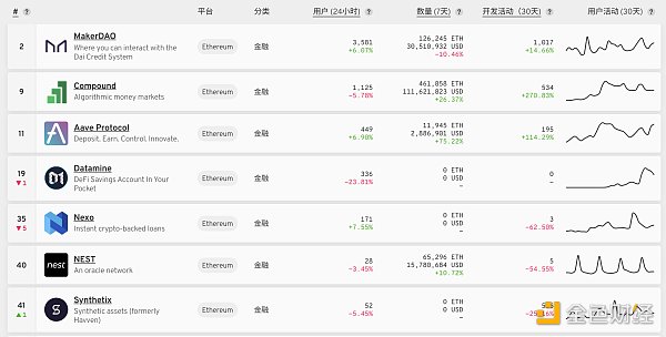 但顯而易見的評定標準中最具代表性的一定是用戶量,在DApp排名第一的游戲里,顯示其24小時用戶量5703,對比DeFi應用,MakerDAO目前的24小時用戶數在3500左右。
