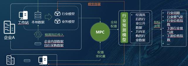 在企業之外有平臺側,上圖中右側部分就是在平臺側發生的。平臺側整合公開數據和外部采購數據,以及企業A和企業B的私域數據,進行聯合運算,就可以得出行業景氣度指數、行業價格指數等。這些統計數據的輸出,可以起到行業預測的作用。在整個環節里,企業的隱私數據沒有暴露又達成了和行業內其他企業進行共享的作用。