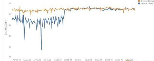 此外,有證據表明,Arbitrum交易量受到平均成本降低的顯著影響,這在Nitro發布后的8月31日峰值中就可看出。近幾月,Arbitrum的交易量大大超過Optimism,甚至在2月21日首次超過了以太坊。