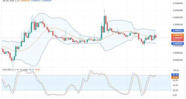 DOGE/BTC價格走勢顯示出大幅走強的跡象。她的價格蠟燭已經達到了BolingerBand的中間波段。然而,下行力量對價格走勢產生了影響,使其略低于布林線均線。