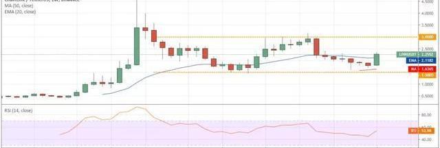 在過去的幾個月里,LINK/USD貨幣對一直在1.50美元和3美元之間波動。這表明多頭購買接近區間支撐,賬面獲利接近阻力位。當前的漲幅在接下來的幾周內將達到3美元。