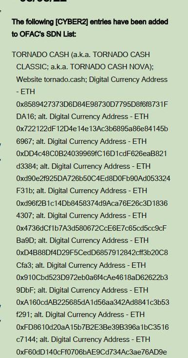 11、對于這種鬼魅一般的代碼,OFAC選擇的制裁手段很粗暴,直接制裁它的38個錢包地址。換言之,任何人、任何機構如果和這些地址轉出的資金有關聯,就有可能遭遇OFAC的二級制裁并被起訴。結果是,大量大型加密資產交易所、DeFi應用、數字錢包等為了滿足合規需求,紛紛和這些地址“劃清界限”,甚至直接凍結那些和這些地址有瓜葛的人的賬戶。